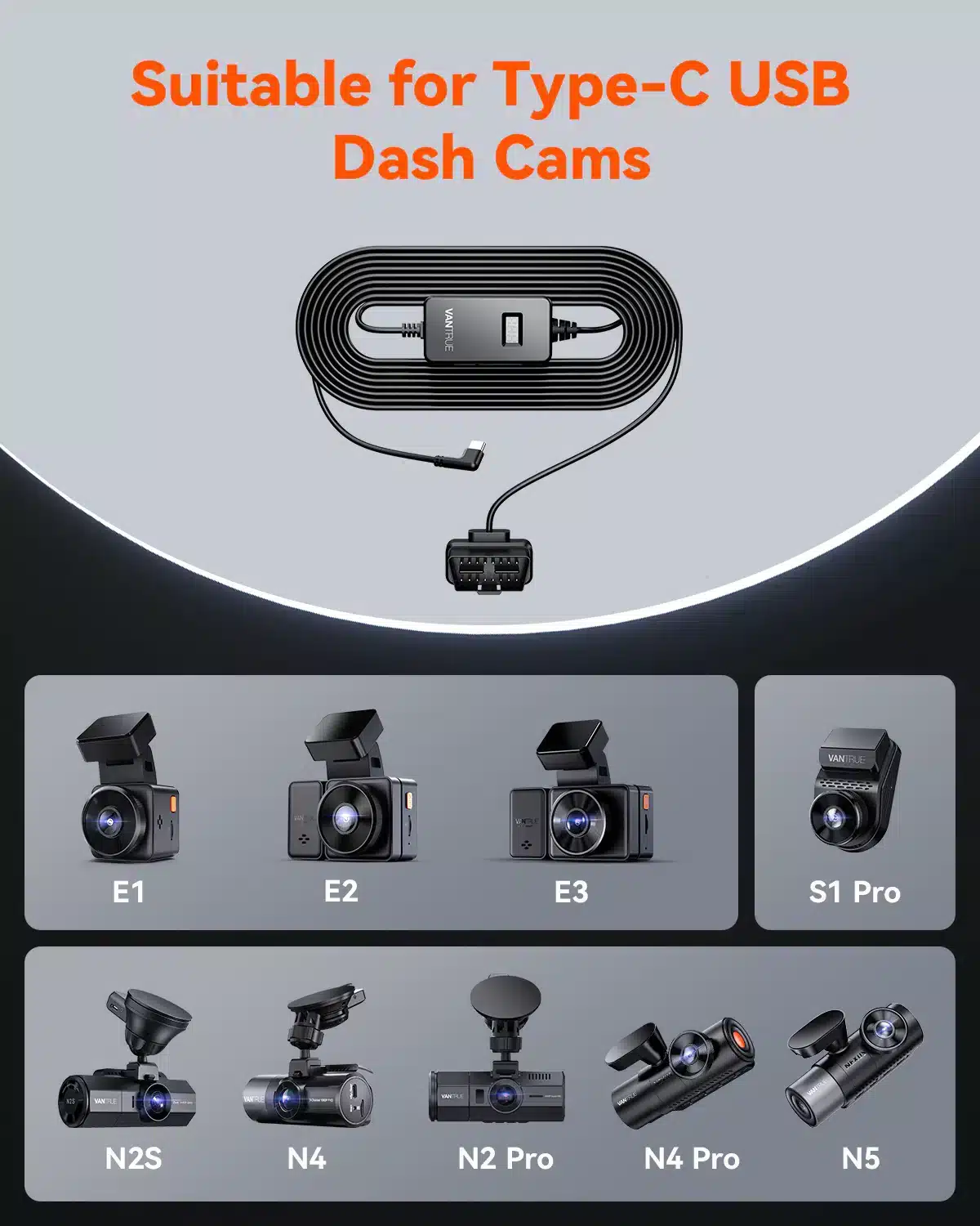Vantrue Voltage Display OBD Cable for N4, N4 Pro, N5, N2 Pro (2023), N2S, N2X, S1 Pro, E1, E1 Lite, E2, E3, E360 ACE, E360, S2-2CH, S2-3CH, X4S, N1 Pro Type C Edition (2023), T3 Dash Cam