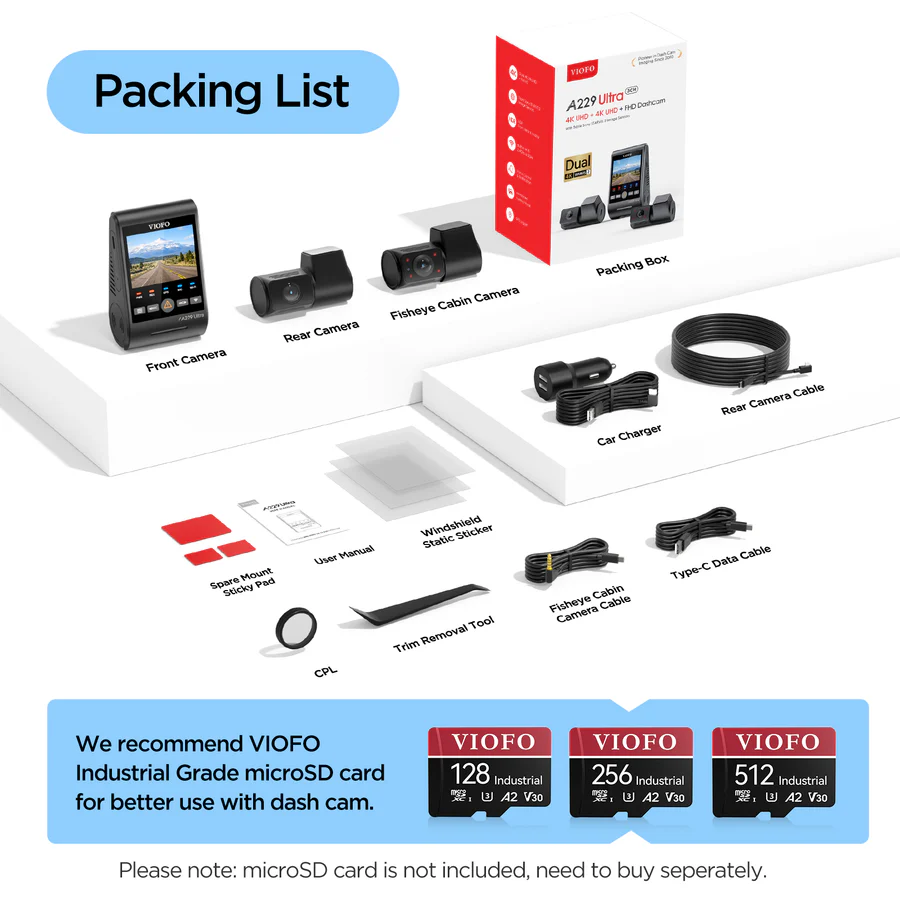Viofo A229 Ultra 3‑Channel 4K Front & 4K Rear Dashcam with 1080P Cabin – STARVIS 2, HDR, Super Night Vision, Parking Mode
