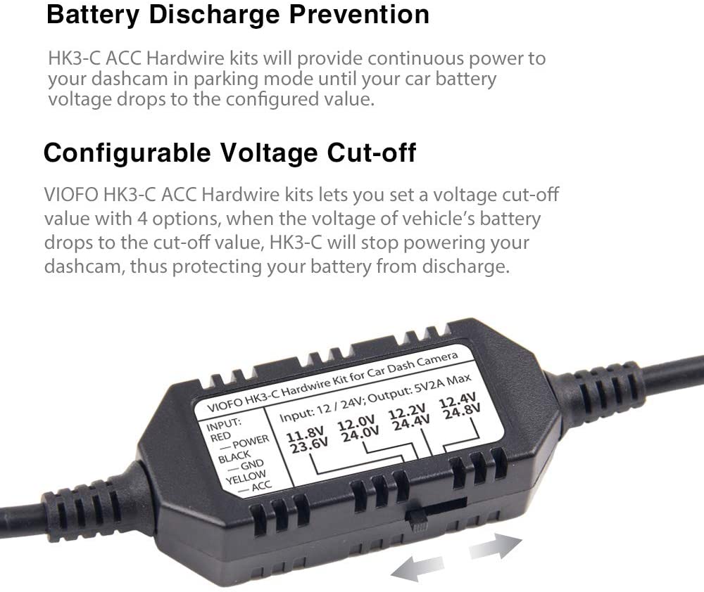 Low Voltage Protection – HK3-C hardwire lets you set a voltage cut-off value with 4 options, when the voltage of vehicle’s battery drops to the cut-off value, it will stop powering your dashcam, thus protecting your battery from discharge.